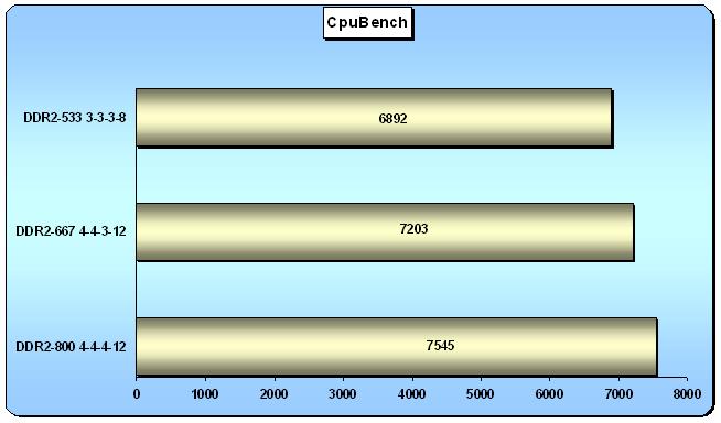 Con questa tipologia di benchmarck possiamo notare come alzando la frequenza di lavoro delle ram anche se usiamo timings molto conservativi, riusciamo ad avere una maggior banda passante e di conseguenza risultati migliori nel vari test. La performance generali delle memorie sono molto buone considerando che, dal funzionamento DDR2-533 MHz a DDR2-800 MHz, si hanno incrementi della banda misurati dai vari applicativi di benchmarking che si attestano intorno al 20% di incremento. Questo si traduce in termini di potenza di calcolo puro in un decremento del 10% del tempo di calcolo del SuperPI 2M. Quindi facendo una relazione empirica, non so quanto valida in generale, per ogni 2 punti percentuali di aumento di banda si ha un decremento di un punto percentuale del tempo di calcolo del SuperPI.